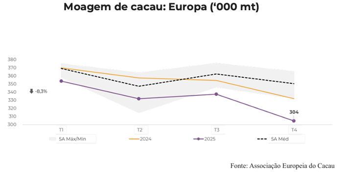 - Dados de moagem do T4 de 2025 reforçam o enfraquecimento da demanda global, com fortes quedas na Europa.