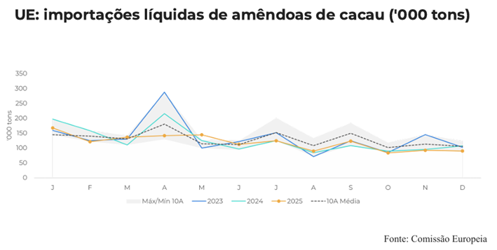 Em contraste com esse cenário, os dados da Associação Nacional de Confeiteiros (NCA) indicam que a moagem na América do Norte avançou 0,35% no T4 na comparação com o mesmo período de 2024. Nos Estados Unidos, as importações líquidas de cacau permaneceram firmes ao longo do ano, totalizando 238,7 kt até outubro, frente a apenas 42,5 kt no mesmo intervalo de 2024.