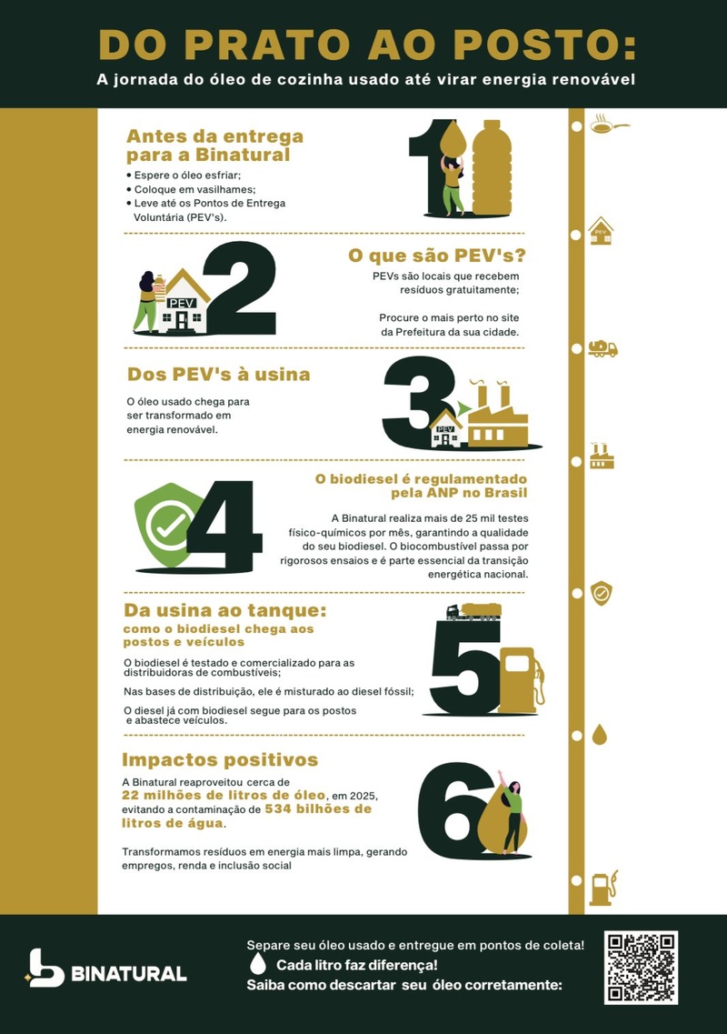 O que sobra na frigideira depois da fritura pode se transformar em energia que move o Brasil. O óleo de cozinha usado (UCO, da sigla em inglês), quando destinado corretamente, é matéria-prima para a produção de biodiesel, um biocombustível renovável e menos poluente. A Binatural, empresa brasileira especializada na produção de biodiesel, já transformou cerca de 22 milhões de litros de UCO em biocombustível, apenas em 2025, ajudando a evitar a contaminação de 534 bilhões de litros de água.