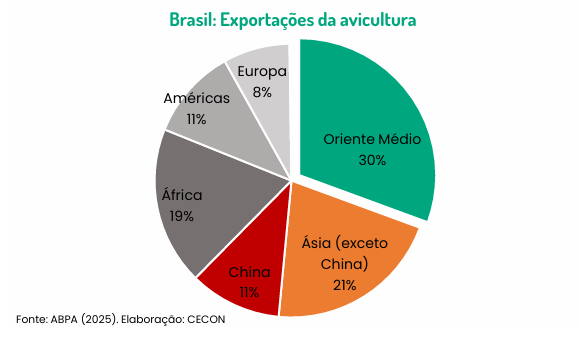 O Oriente Médio, em si, é um destino importante para a proteína animal brasileira, especialmente para a avicultura, absorvendo mais de 30% das exportações, atrás apenas da Ásia, com participação ligeiramente superior. A interrupção parcial ou total do comércio com a região, ou dificuldades logísticas decorrentes do fechamento de rotas comerciais importantes que passam por lá, poderiam restringir a capacidade de exportação do Brasil, complicar as operações portuárias e deslocar os fluxos comerciais. Do ponto de vista das cadeias globais de valor, a situação evidencia a vulnerabilidade das redes logísticas interligadas e a dependência do setor de proteínas do Brasil de um transporte marítimo previsível.