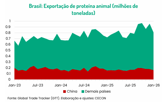 O ponto crítico, no entanto, surge depois. Uma vez esgotada a cota, a capacidade de redirecionamento torna-se central. Os volumes que deixarem de seguir para a China (equivalentes a 11% a 17% de todas as exportações brasileiras de carne bovina, tomando como base o volume exportado no total de 2025) só não pesarão negativamente sobre o desempenho anual se encontrarem espaço em outros mercados. E pesa em favor do Brasil o fato de que a China já vinha perdendo espaço gradativamente na pauta exportadora brasileira de proteínas animais, representando 20,8% dos embarques totais em 2025, abaixo dos 23,2% registrados em 2024. Mas, ainda assim, o cenário é desafiador.