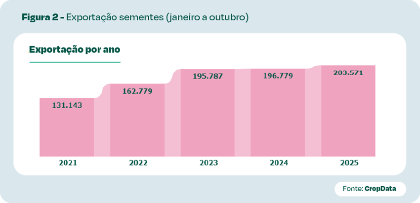 | Valor atinge US$ 204 mi de dólares, com predomínio de destinos sul-americanos, segundo dados do CropData; Importação de produtos químicos cresce 19% no período “O recorde nas exportações em valor indica que o Brasil está, de fato, exportando mais tecnologia incorporada às sementes, sobretudo para países da América do Sul — principal destino desse fluxo comercial. O país avançou significativamente em melhoramento genético e na oferta de materiais de alto desempenho, o que se reflete no aumento do valor exportado. Em termos de volume, as exportações passaram de 41.647 toneladas em 2024 para 39.098 toneladas em 2025 (janeiro a outubro)”, destaca o gerente executivo da CropLife Brasil, Renato Gomides, quanto aos players sul-americanos. “Apesar da redução em toneladas, houve elevação no preço unitário médio em US$ 0,49/kg (média 2025: US$ 5,21/kg), evidenciando maior valor agregado dos materiais exportados”, completa a análise a gerente de Assuntos Econômicos da CLB, Maria Xavier. As importações de produtos químicos no acumulado de janeiro a outubro de 2025 tiveram alta de 19% em receita, totalizando US$ 11,9 bilhões de dólares, aumento de US$ 1,9 bilhões em comparação ao mesmo período de 2024. A CropLife Brasil monitora o desembarque de defensivos químicos formulados e, também, em composição técnica e matéria-prima importada, estes dois últimos utilizados pela indústria de defensivos químicos para formulação local. “O aumento da receita de importações está diretamente relacionado ao maior volume importado no período. De janeiro a outubro, o volume importado aumentou em 27% – de 1.162.482 toneladas em 2024 para 1.476.343 toneladas em 2025 -, um crescimento expressivo. Apesar da expansão de volume, houve queda nos preços unitários, o que explica por que o valor total importado cresceu mesmo em um cenário de depreciação de preços. Esse movimento — mais volume e menor preço médio — decorre principalmente da maior participação de produtos genéricos nas compras externas, com destaque para os produtos já formulados”, explica Renato. Do crescimento observado, US$ 800 milhões são de importação de produto formulado, com destaque para herbicidas e inseticidas. Já a importação de produto técnico alcançou US$ 2,1 bilhões nos 10 primeiros meses deste ano. Registros de Produtos No último mês, não houve atualização no registro de novos produtos Químicos ou Bioinsumos. A CropLife Brasil monitora o registro de insumos agrícolas conforme atualização disponibilizada pelo Ministério da Agricultura e Pecuária (MAPA). CropData O CropData é a plataforma de dados da CropLife Brasil que reúne, de forma inédita e em um só lugar, informações dos setores de sementes, bioinsumos e químicos. Nele é possível encontrar números de faturamento, crédito, impostos e pesquisa e desenvolvimento (P&D) das tecnologias agrícolas, além de indicadores de mercado, comércio exterior, ESG, empregos e salários, registros de produtos e uso/hectaredos. Para além da consulta e democratização do acesso a dados setoriais, o CD tem como objetivo dar transparência do setor de soluções para o campo, promoção de bases da indústria e ampliação do acesso público a informações estratégicas do agronegócio brasileiro. |