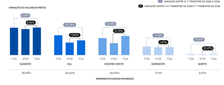 Na região Sudeste, que representa 38,68% da demanda nacional de fretes, o crescimento foi menor: 0,65% no comparativo com o 1º trimestre do ano passado e 5,96% em relação ao último trimestre de 2025.