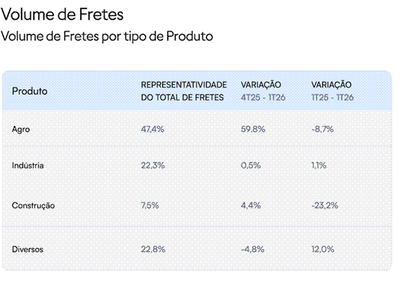 A indústria, por sua vez, respondeu por 22,3% do volume total de fretes contratados (crescimento de 1,1% frente a igual período do ano anterior). Já o setor de construção civil, que hoje responde por 7,5% do volume, mostrou sobrevida no curto prazo (+4,4% ante o 4T25), mas segue acumulando uma retração de -23,2% em relação ao primeiro trimestre do ano anterior. Outros segmentos responderam por 22,8% do volume.