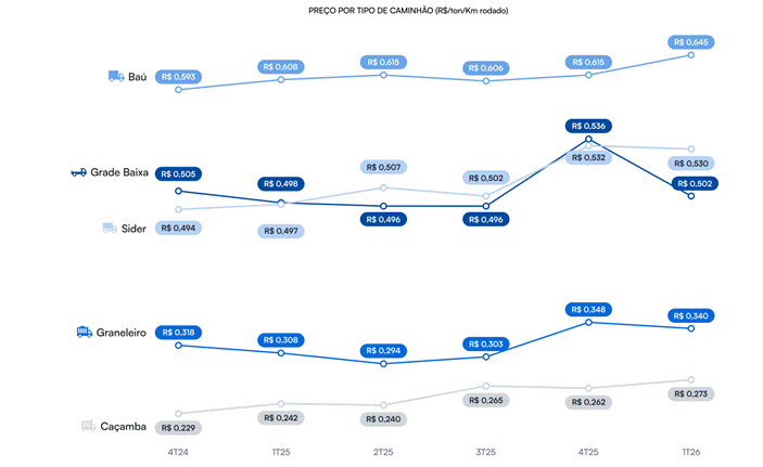 De acordo com o levantamento, no 1º trimestre de 2026, a competição por caminhões continuou sustentando os valores acima do observado no ano anterior. A tarifa média consolidada saltou de R$ 0,359 no 1º trimestre de 2025 para R$ 0,395 no trimestre atual, registrando um crescimento de 10% na variação anual.