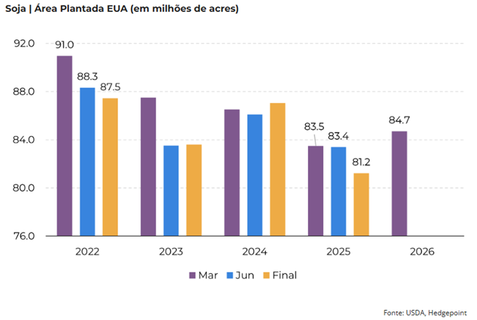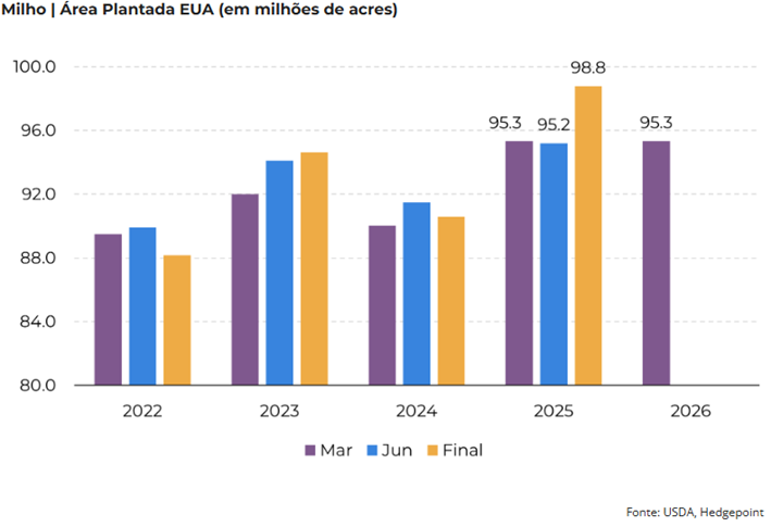 Segundo o USDA, a área a ser plantada com soja em 2026/27 é estimada em 84,7 milhões de acres, com avanço de 3,5 milhões de acres em relação à temporada anterior (81,2 milhões de acres), ou +4,3%. Já no caso do milho, a área deve atingir 95,3 milhões de acres, com queda de 3,5 milhões de acres frente à safra passada (98,8 milhões de acres), ou -3,5%.