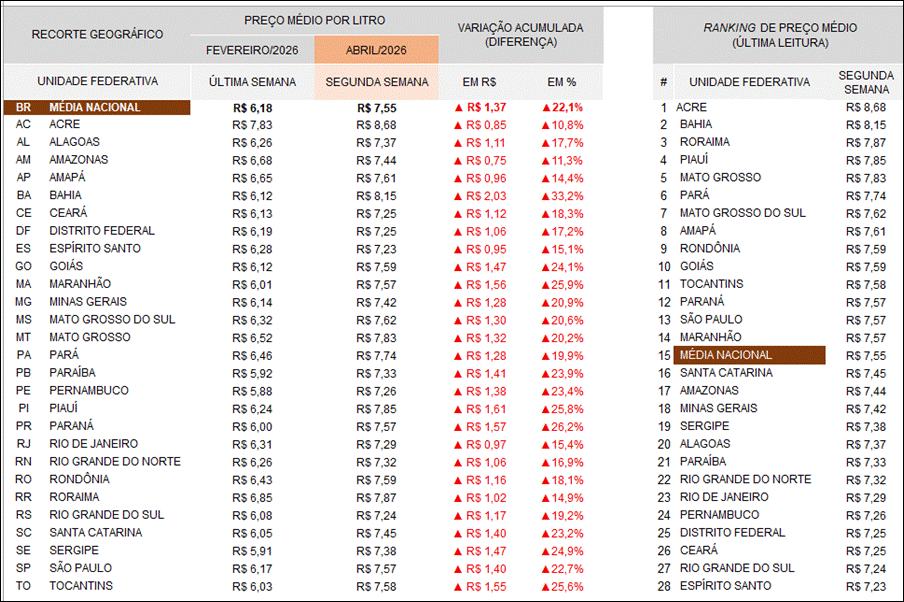 | Dados da Veloe destacam que os preços dos combustíveis atingiram pico no fim de março e início de abril. Maiores aumentos ocorreram na Bahia, Paraná e Maranhão Divulgação Veloe Nas últimas semanas, o avanço expressivo dos preços dos combustíveis, especialmente do diesel S-10, colocou o país em estado de apreensão, tendo em vista seus efeitos sobre os demais preços da economia e, consequentemente, sobre o custo de vida da população. De acordo com os dados do Monitor de Preços de Combustíveis da Veloe, produzidos com apoio técnico da Fundação Instituto de Pesquisas Econômicas (Fipe), o preço desse combustível, essencial para o transporte de cargas em todo o país, acumulou uma alta de 22,1% entre a última semana de fevereiro e a segunda semana de abril. O levantamento revela que o diesel avançou mais que os preços da gasolina comum (+7,5%) e o etanol (+1,9%) no período, marcado pelo acirramento e, mais recentemente, por impasses na resolução do conflito no Oriente Médio. Evolução semanal dos preços nacional do Diesel S-10, Etanol e Gasolina Comum A alta nos preços nacionais do combustível foi capitaneada por: Bahia (+33,2%), Paraná (+26,2), Maranhão (+25,9%), Piauí (+25,8%) e Tocantins (+25,9%). As menores altas, por sua vez, ocorreram no Norte do país: Acre (+10,8%), Amazonas (+11,3%), Amapá (+14,4%) e Roraima (+14,9%). Os resultados das últimas duas semanas, contudo, apontam para uma trégua na alta dos preços dos combustíveis – dialogando com anúncios de cessar-fogo e negociações em curto entre os países envolvidos no conflito internacional. O preço do diesel atingiu seu maior valor na última semana de março (R$ 7,62 por litro) e desde então, registrou discreto recuo na cotação nacional, para R$ 7,55. Os sinais de estabilização também foram observados nos demais combustíveis monitorados: o etanol hidratado atingiu seu maior preço nacional na última semana de março (R$ 4,80 por litro), enquanto o litro da gasolina comum marcou R$ 6,87 na média da primeira semana de abril. Apesar dessa acomodação, o cenário atual revela grande discrepância regional nos preços cobrados pelo abastecimento com Diesel S-10. Em termos absolutos, essa diferença foi de R$ 1,45 por litro na última leitura (segunda semana de abril) – o que corresponde a uma diferença percentual de 20% entre o maior e o menor valor por estado. O Acre lidera o ranking dos maiores preços desse combustível, com o litro cotado a R$ 8,68. O estado nortista foi seguido pela Bahia, a R$ 8,15, e Roraima, a R$ 7,87. Na sequência aparecem Piauí, Mato Grosso e Pará, todos com preços acima do patamar de R$ 7,70 por litro. Em contraste, os estados com menores preços por litro do na segunda semana de abril incluam: Espírito Santo (R$ 7,23), Rio Grande do Sul (R$ 7,24), Ceará (R$ 7,25), Distrito Federal (R$ 7,25) e Pernambuco (R$ 7,26). Apesar da acomodação, o cenário ainda pode trazer pressões para os demais preços da economia e, consequentemente, para a consumidor final. A dúvida agora é se os sinais de trégua – nos preços e no conflito – vão se consolidar ou se novos aumentos estão no horizonte das próximas semanas. |