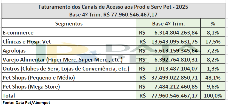 Em relação aos canais de acesso, pet shops pequenos e médios permanecem como quase metade de todo movimento do varejo, movimentando R$ 37,49 bilhões. Em segundo lugar estão as clínicas e hospitais veterinários, que representam cerca de 17,5% do faturamento (R$ 13,64 bilhões). Completando o pódio, as cadeias de mega stores pet tem uma fatia de 9,6%, faturando R$ 7,48 bilhões.