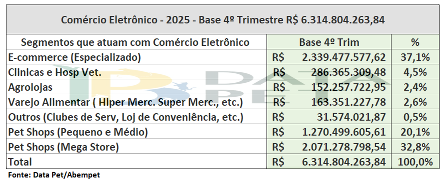 Dentro do segmento de e-commerce, o varejo especializado mantém a frente e segue sendo o segmento que mais vende. Os pet shops virtuais representam 37,1% do faturamento, com R$ 2,34 bilhões, seguido pelas lojas virtuais das mega stores, com R$ 2,07 bilhão (32,8%) e pelas lojas virtuais de pequenos e médios pet shops, com R$ 1,27 bilhão (20,1%).