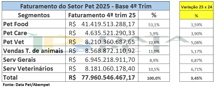 A venda de alimentos industrializados para animais de estimação encerrou 2025 com R$ 41,42 bilhões (53,1% do total do setor). Em seguida, vem a venda de animais por criadores, representando R$ 8,5 bilhões, ou 11% do faturamento do mercado. Logo depois, os produtos veterinários (pet vet) representam R$ 8,2 bilhões, ou 10,6% do total do faturamento do setor. Serviços veterinários são o quarto maior segmento em faturamento, com R$ 8,18 bilhões (10,5%).